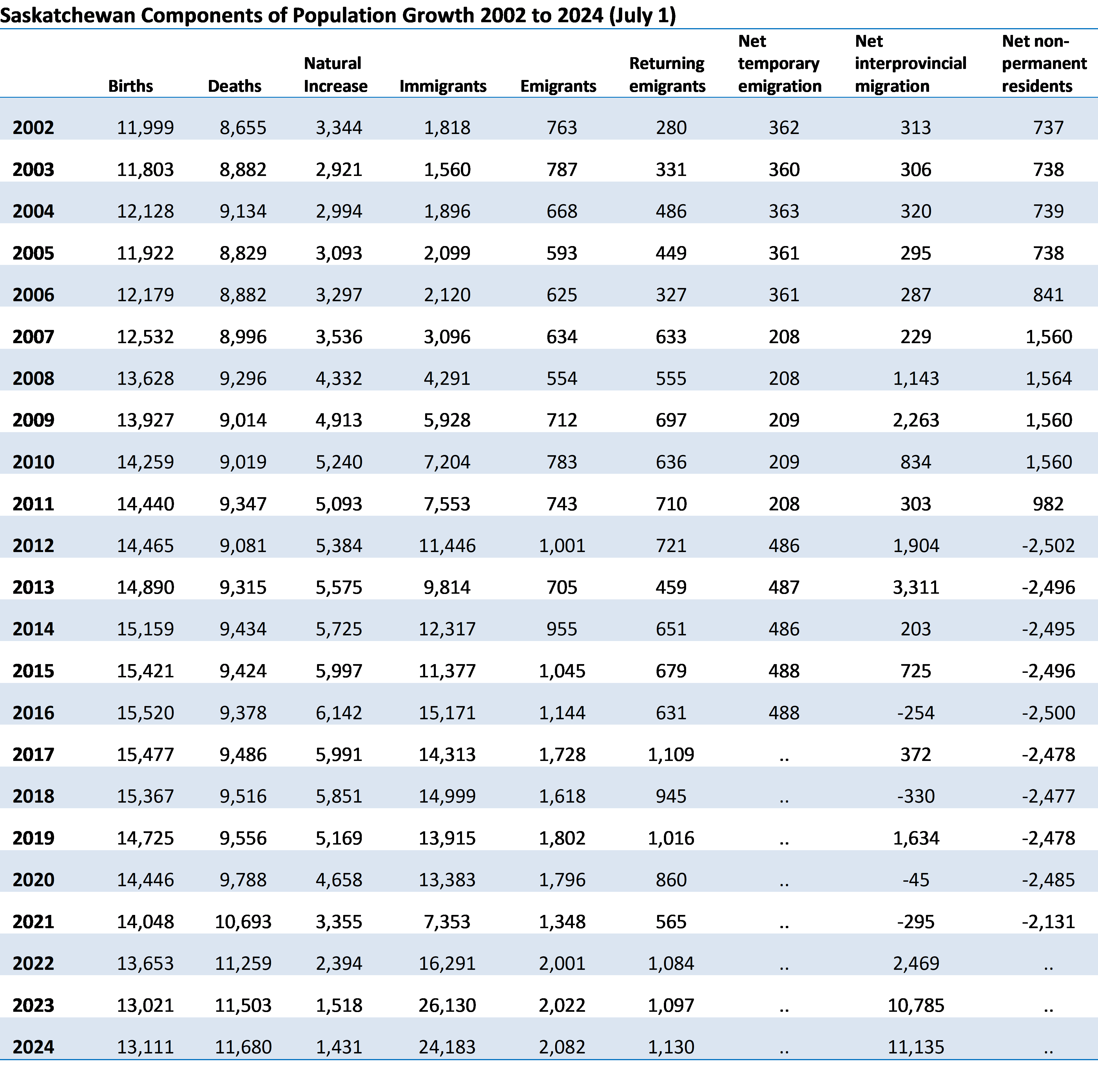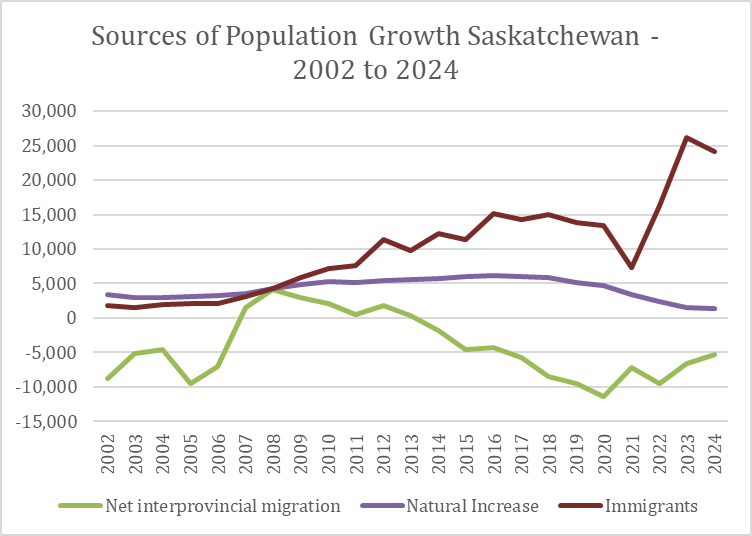 In the case of Saskatchewan, immigration has outstripped natural increase as the leading contributor of population growth since, and including, 2009. From 2016 to 2024, excluding 2021, immigration is more than double natural increase.