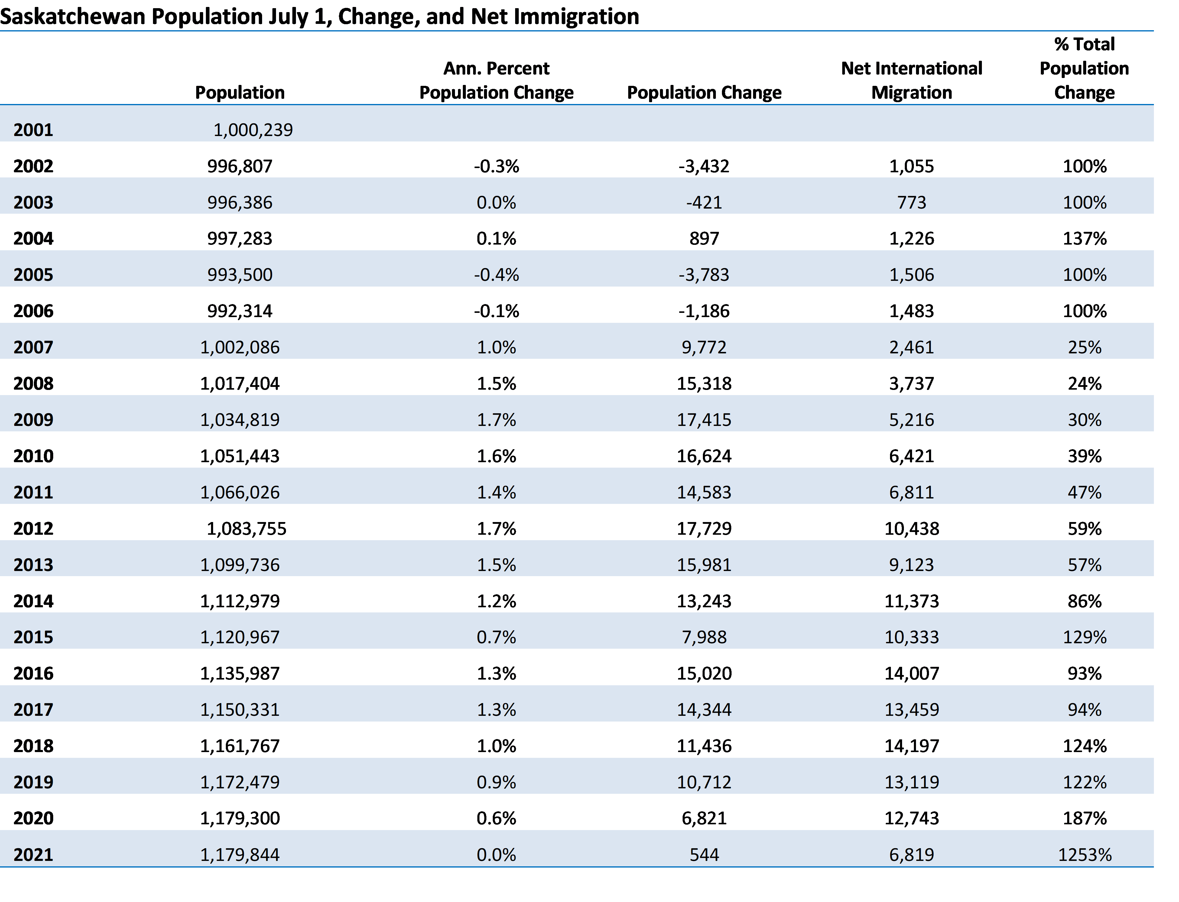 While immigration increased rapidly up to 2020, the less important components are essentially flat or, in the case of natural increase, advancing slowly with a marked decline in 2021. Since 2002, net interprovincial migration was negative with the exception of 2007 to 2013. Driving positive net interprovincial migration during 2007 to 2013 were peak or near peak resource prices, notably oil and potash, coupled with a lack of employment opportunities in much of the rest of Canada.